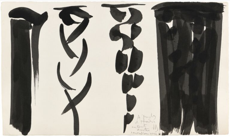 Après avoir réalisé ses toutes premières toiles abstraites pendant l’hiver 1942-1943, Debré fait son expérience lithographique dans l’atelier de Jean Pons, rue de Vaugirard. A la même époque, il produit de nombreux dessins à l’encre de Chine qui sont très calligraphiques. C’est à cette période qu’apparaît l’appellation de signes-personnages.