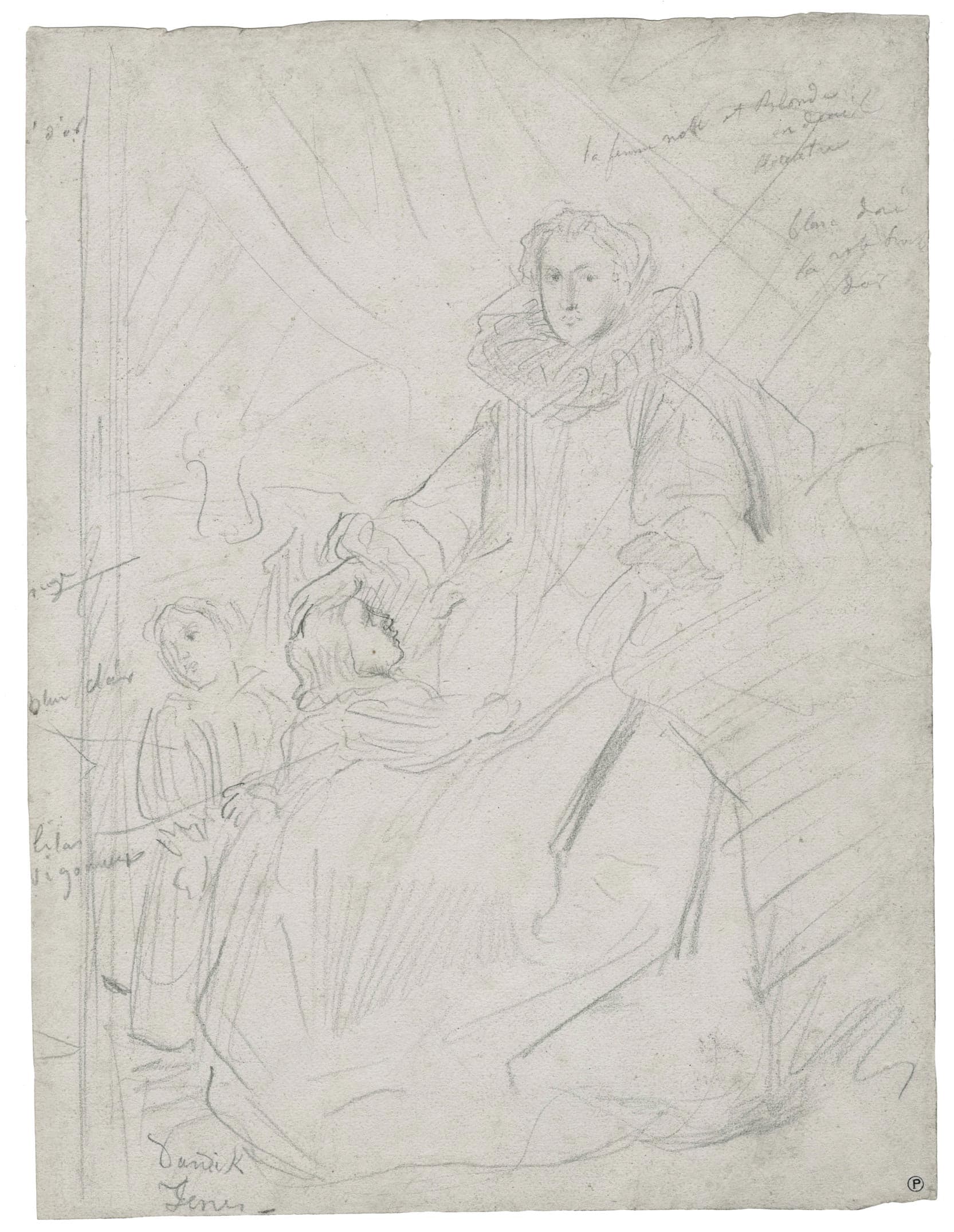 En bas à gauche au crayon graphite Vandick / Genes ; plusieurs annotations au crayon graphite : la femme noble et blonde / en deuil / […] // blanc doré // la robe brodé / d’or // d’or // rouge // bleu clair // lilas vigoureux