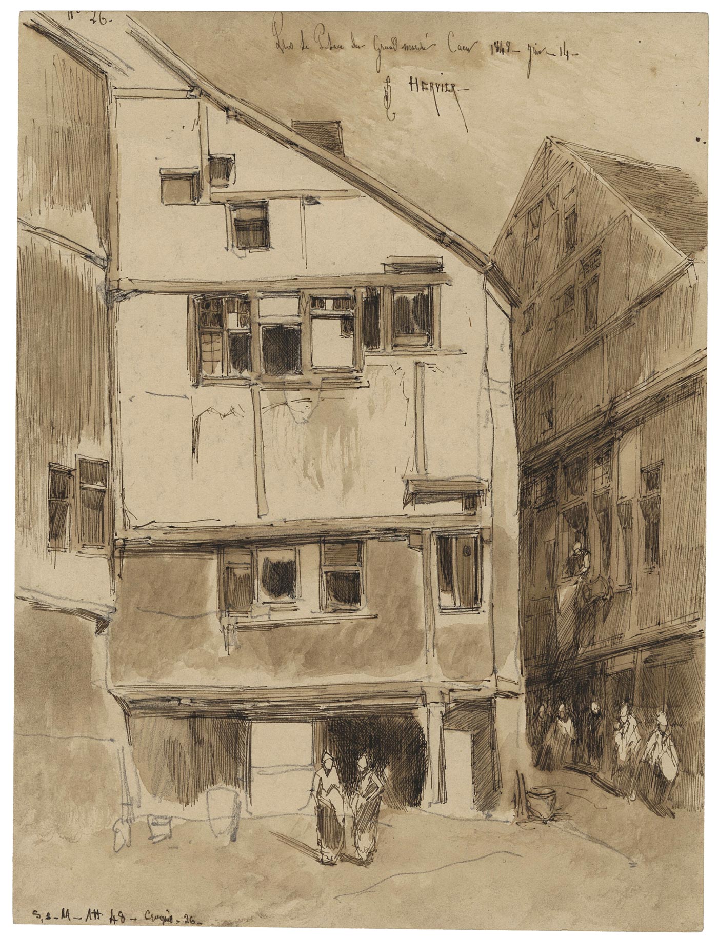 Numéroté, situé, daté, monogrammé et signé à la plume et encre brune en haut n°26 / Pris de Place du Grand marché Caen 1848 – juin – 14 / Hervier, annoté à la plume et encre brune en bas à gauche S1 – 11 – Att – 48 – Croquis 26