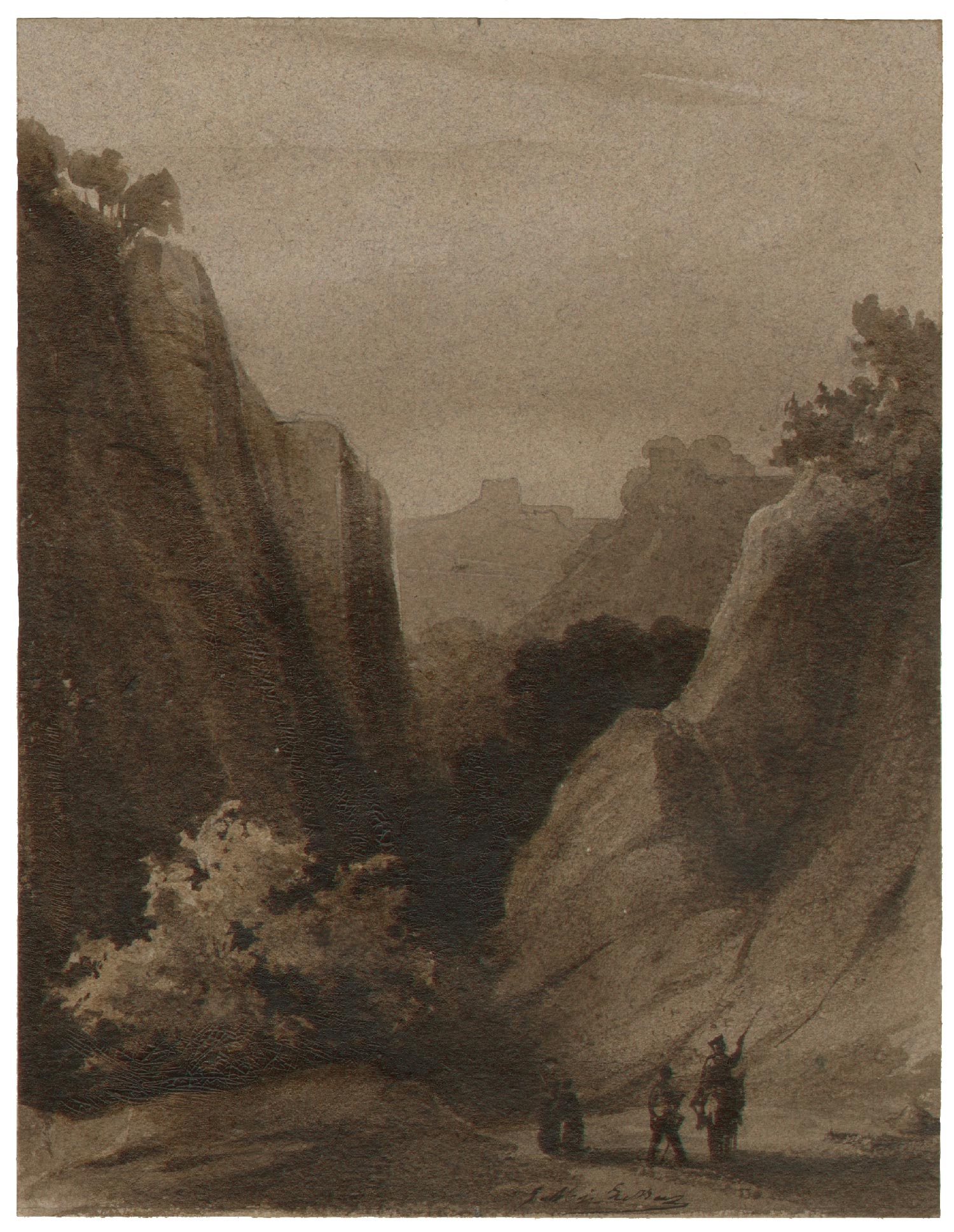 Pinceau et lavis d’encre brune sur préparation au crayon graphite et gomme arabique, contrecollé sur papier