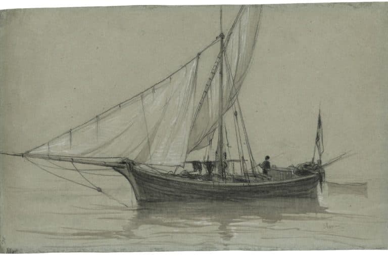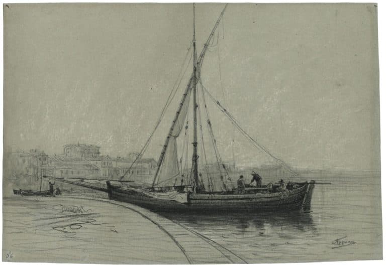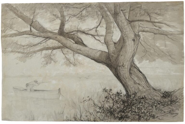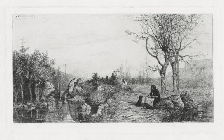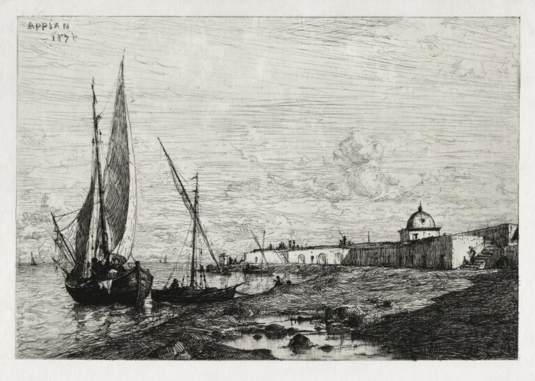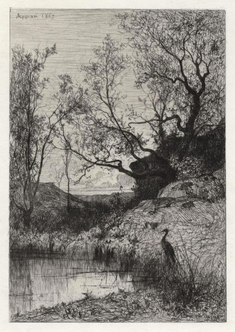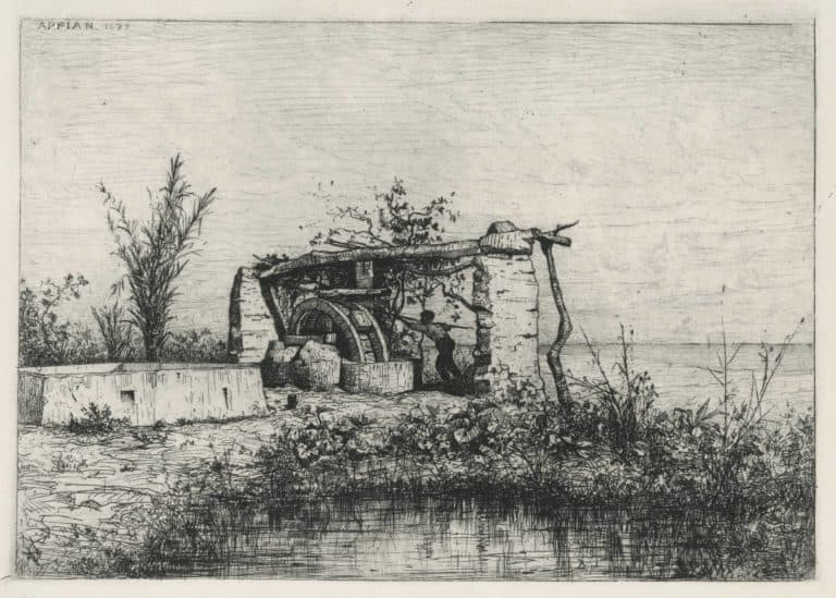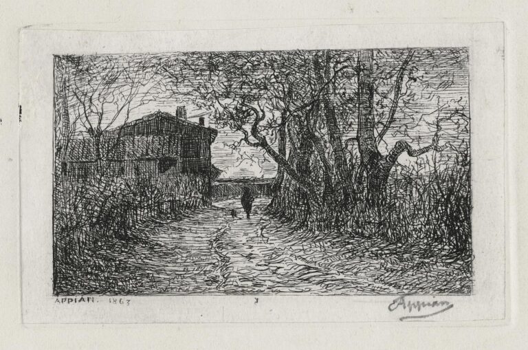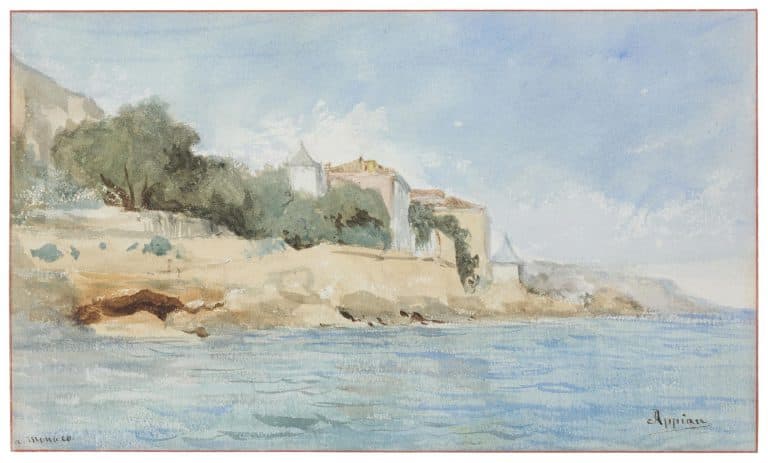 Born in Lyon in 1818, where he died in 1898, Adolphe Appian is one of the major representatives of the important landscape school that developed in the 19th century in the city of Lyon. Close to the Barbizonians (and to Corot and Daubigny in particular), Appian applied the new naturalist principles to the representation of his native region. A recognized painter, who regularly exhibited at the Salons, he was also a prolific draftsman and above all a talented engraver. Author of ninety etchings (reproductions of his paintings or original compositions, landscapes or seascapes) which he took care to have printed by Delâtre and published by Cadart, he also produced about thirty monotypes (towards which his assiduous research of the effects of inking and wiping could only lead him) which precede by about ten years the experiments of a Paul Huet and a Degas. Appian excelled in the study of the momentary effects of light and knew how to render nature in its simplest and most familiar aspects: undergrowth, streams, rocks, whose multiform physiognomy he admirably rendered. From the mountainous and wooded landscapes of Bugey and Dauphiné to the shores and harbors of southern France, water is always present in his compositions.
