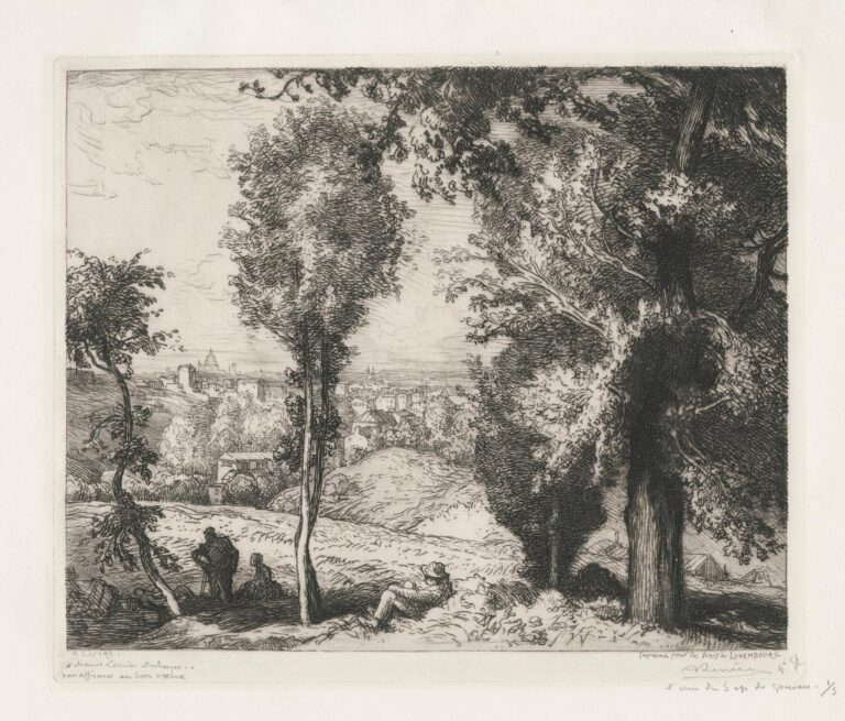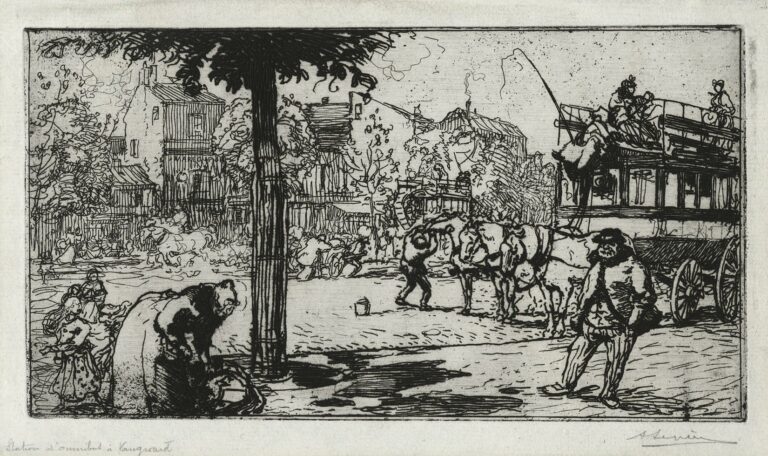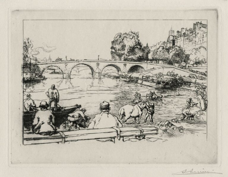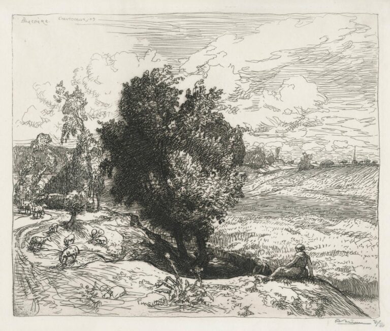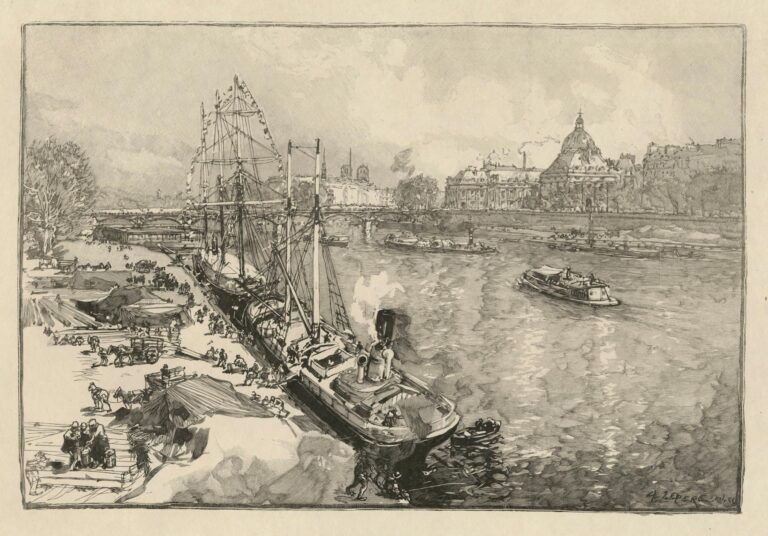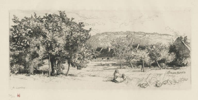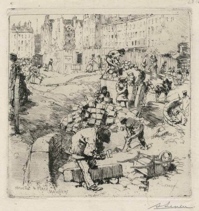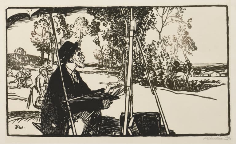 S’il réalisa quelque cent cinquante eaux-fortes et une quinzaine de lithographies, c’est pour ses réussites dans le domaine de la xylographie qu’Auguste Lepère connut le succès et passa à la postérité. Fils de sculpteur, entré très jeune dans l’atelier du graveur sur bois Joseph Burn-Smeeton, Lepère travailla d’abord à fournir les journaux en illustrations de bois de bout (on en dénombre presque un millier). Attiré par le dessin et la peinture d’une part, contraint de l’autre par l’avancée envahissante des procédés de reproduction photomécanique, Lepère se tourna par la suite vers l’estampe originale (pour le livre ou pour la décoration). Réalisées en bois de fil, parfois colorées, au trait toujours plus simplifié et stylisé (et en opposition avec la subtile gradation des teintes qui avait d’abord fait la réputation de l’artiste), ces estampes de Lepère (quelques paysages d’Île-de-France ou de Vendée et de nombreuses vues urbaines, surtout parisiennes) tiennent un rôle précurseur dans la renaissance de la xylographie à la fin du XIXe siècle.