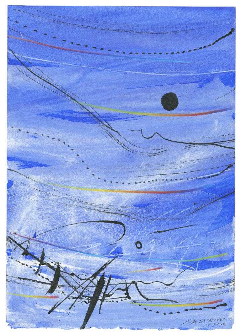 Julius Baltazar had his first exhibition in Paris at the age of sixteen. He was named Baltazar because of Salvador Dali, who introduced him to literary and artistic circles in 1967 and introduced him to Fernando Arrabal. The three of them then founded the Intra realist movement known by a single exhibition of collages and unusual objects. After a first training in jewelry, he discovers, through his friend Pierre Dmitrienko, the techniques of intaglio engraving with Georges Visat, editor of the surrealist painters in Paris – Max Ernst was the first collector of works on paper by Julius Baltazar – then Alain Piroir, who then became his intaglio engraver. In the 1970s, the artist met many painters: Marfaing, Cortot, Debré, Ubac, Saura, Benrath, Laubiès. From 1975, he definitively asserts himself as a lyrical abstract painter. He gave equal importance to color and line. Other encounters, just as decisive, are those with the author and art critic Guy Marester, the bookseller-publisher Jacques Matarasso in Nice, or the publisher André Biren in Paris. Then begins a rich collaboration with writers and poets. Among them, Michel Butor, Michel Bohbot, Lucien Scheler, Michel Déon, Eugène Guillevic. Julius Baltazar conceives and realizes with them printed, painted and handwritten books. The atmospheric and celestial dimension of his handwritten paintings inspires men of letters who come with pleasure to decorate them with their texts or their verses.