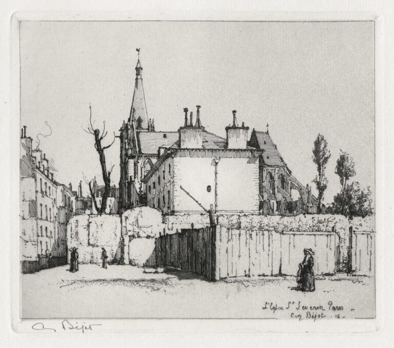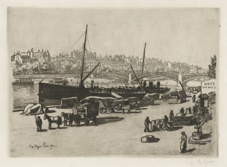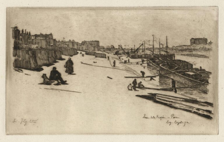 Formé à l’Académie Julian (où il se lia notamment d’amitié avec Ibels), Eugène Béjot apprit son métier de graveur auprès d’Henri Guérard. Il put profiter par ailleurs des conseils des maîtres de l’eau-forte qu’étaient Bracquemond, Buhot et Seymour Haden. L’œuvre de Béjot est tout entier consacré aux paysages urbains et particulièrement à ceux de Paris : s’éloignant des vues pittoresques chères au romantisme, l’artiste devait porter un intérêt spécial aux grands espaces et aux trouées de lumière et la Seine fut parmi ses motifs favoris. Béjot réalisa un peu plus de quatre cents eaux-fortes, parmi lesquels se distinguent les suites fameuses de La Seine à Paris, des Bateaux de Paris et des Arrondissements de Paris.