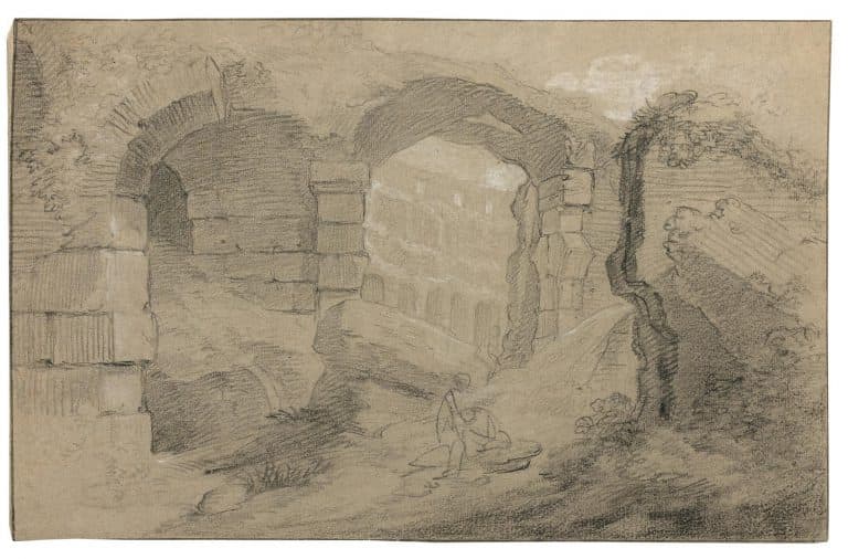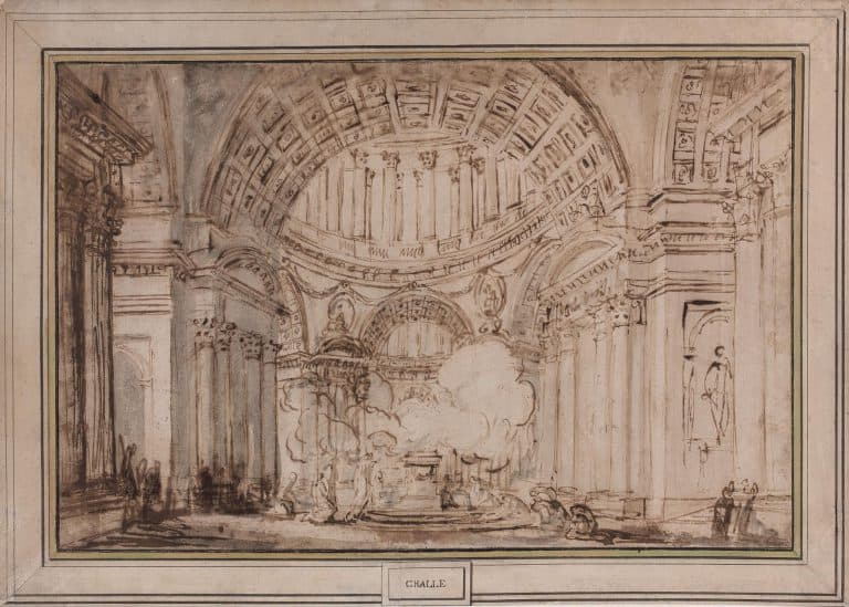 Après une formation initiale en tant qu’architecte, Charles-Michel-Ange Challe se dirige vers la peinture. Elève de Lemoyne et de Boucher, Challe obtient en 1741 le grand Prix de l’Académie Royale de Peinture et de Sculpture, ce qui lui permet d’accomplir le voyage à Rome où il séjourne sept années (1742-1749). Il découvre alors les ruines de l’Antiquité romaine et subit l’influence des peintres d’architecture italiens, Panini et surtout Piranèse. Reçu à l’Académie royale en 1753, il devient professeur de perspective en 1758 et fut nommé dessinateur de la Chambre et du Cabinet du roi en 1764.