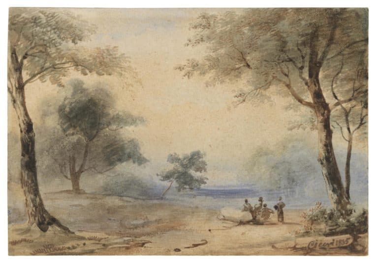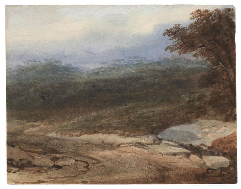 Pierre-Luc-Charles Cicéri was a protean artist: a painter, theatre decorator, landscape artist and caricaturist, he was also a pupil of the architect François-Joseph Bélanger before becoming chief decorator at the Paris Opera. He subsequently held official positions for King Jerome of Westphalia, and then for King Charles X. Cicéri is also famous for his caricatures, his prolific production of watercolour landscapes – to which the present work belongs – and his lithographic illustrations for Baron Taylor’s Voyages pittoresques et romantiques dans l’ancienne France. Finally, he was the father of the artists Eugène Cicéri and Ernest Cicéri.