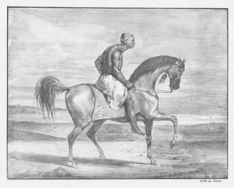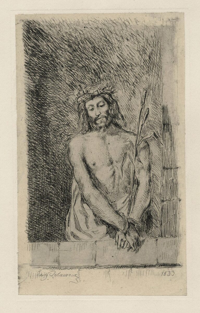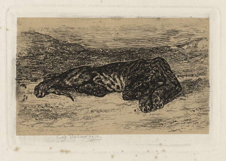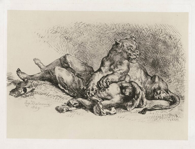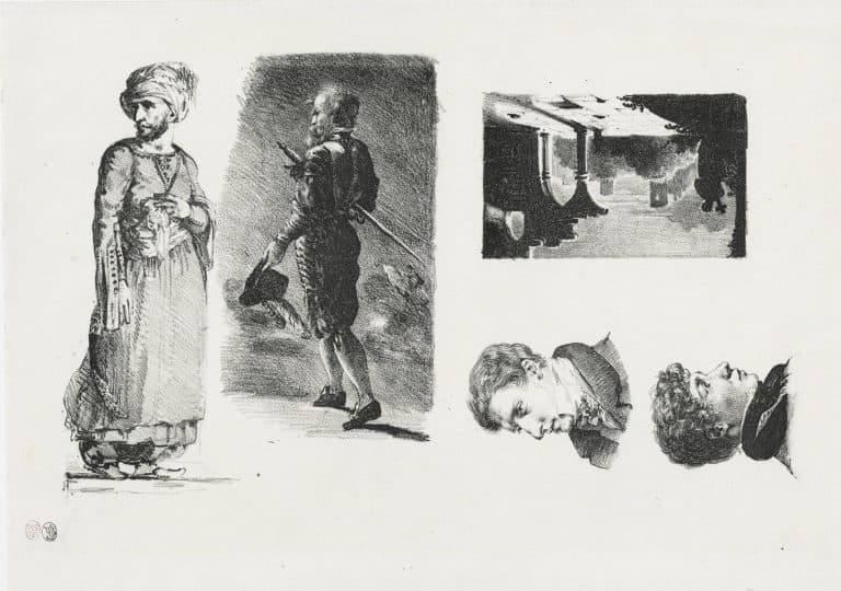 De Delacroix, la postérité a surtout retenu le peintre coloriste auteur de quelques-uns des plus célèbres tableaux du XIXe siècle ; cependant, il fut aussi un dessinateur extrêmement prolifique et talentueux (ses feuilles, surtout des croquis, exécutés aussi bien à la mine de plomb qu’à la plume, au pastel qu’à l’aquarelle, se comptent par milliers) et l’un des principaux représentants de l’estampe romantique. Son œuvre imprimé comprend un peu plus de cent trente numéros : s’il donna une vingtaine d’eaux-fortes (souvent sur fond d’aquatinte), en grande majorité avant 1834, Delacroix se consacra particulièrement à la lithographie. Ses cent planches reprennent les thèmes qui ont fait sa gloire : sujets orientaux (inspirés de son fameux séjour marocain de 1832), fauves et chevaux (le Cheval sauvage terrassé par un tigre compte parmi ses pièces les plus célèbres). Cependant, ce sont sans doute ses suites littéraires de Faust, Hamlet et Goetz de Berlichingen qui lui valurent en ce domaine ses plus grands succès.