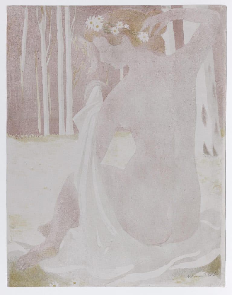 Peintre nabi réputé pour son mysticisme religieux et sa palette pastel, Maurice Denis eut une importante activité de décorateur, non seulement sur les murs (coupole du Théâtre des Champs-Élysées) mais également sur papier : il considérait en effet l’illustration comme « la décoration d’un livre ». Sous l’égide de l’éditeur et marchand Ambroise Vollard, il illustra notamment Sagesse de Paul Verlaine ou Le Voyage d’Urien d’André Gide de gravures sur bois, dont la réalisation fut confiée au graveur professionnel Jacques Beltrand. Bien que le bois obligeât à une simplification favorable au symbolisme, Denis y renonça rapidement. Étant étranger à la cuisine savante de l’eau-forte, il devint maître dans le maniement de l’outil lithographique (lavis, grattage, « crachis ») avec l’aide de l’imprimeur Auguste Clot. Cette collaboration donna le jour au recueil de douze grandes lithographies en couleur intitulé Amour (1899), point d’orgue de la production imprimée de l’artiste, qui pratiqua ensuite l’estampe de manière plus ponctuelle et anecdotique : faire-part, programmes, ex-libris.