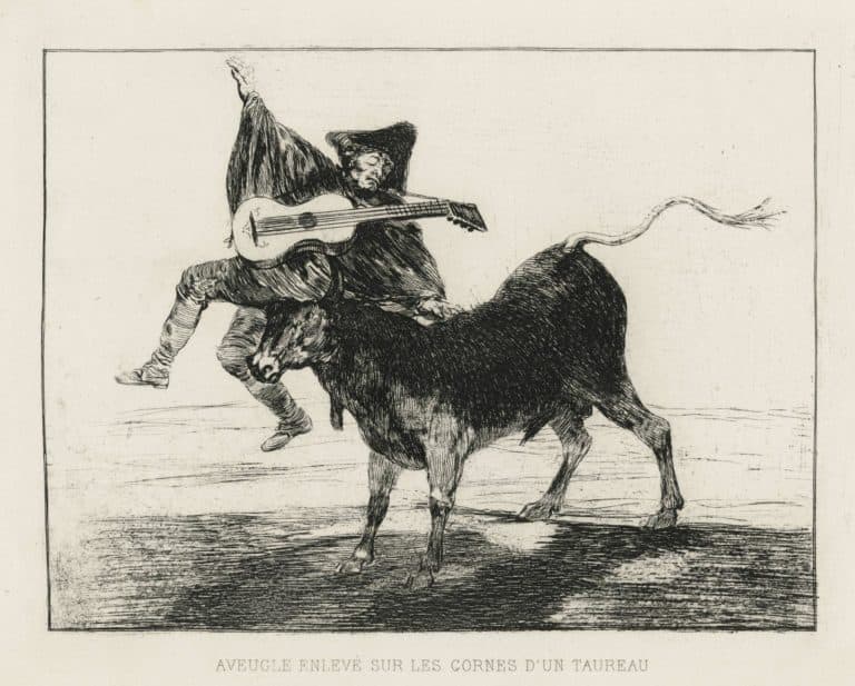 Autant qu’un peintre hors du commun, qui donna plusieurs tableaux parmi les plus célèbres de l’histoire de l’art, Francisco Goya y Lucientes fut graveur. Soigneusement préparées par de nombreux dessins préparatoires (qui se distinguent par un usage très libre du lavis), réalisées à l’eau-forte et à l’aquatinte (technique nouvelle dans laquelle Goya parvint à exceller), ses estampes, loin des scènes de genre et surtout des portraits qui firent son succès, donnent de l’artiste une image plus personnelle, plus proche de l’homme des Lumières visionnaire (jusqu’au fantastique) et socialement engagé (jusqu’à l’exil) que Goya était. Au nombre de deux cents quatre-vingt-onze (parmi lesquelles vingt-trois lithographies auxquelles Goya s’essaya à la fin de sa vie), elles forment pour la plupart les quatre séries extrêmement fameuses des Caprices, des Désastres de la guerre, de La Tauromachie et des Proverbes. Peu commercialisées et peu connues du vivant du peintre-graveur (dans un pays où la tradition de l’estampe originale était pratiquement inexistante), elles contribuèrent au XIXe siècle, et plus encore que ses peintures, à faire de Goya un modèle de l’artiste génial.