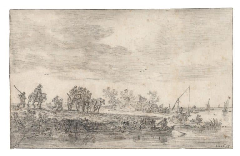 Né à Leyde en 1596, Jan van Goyen reçut sa première formation auprès d’artistes locaux avant de devenir en 1617 l’élève d’Esaias van de Velde à Haarlem ; il devait finalement s’installer à La Haye, où il fut à deux reprises doyen de la guilde de Saint-Luc. Van Goyen fut l’un des paysagistes hollandais les plus prolifiques du XVIIe siècle et mit en œuvre dans ses innombrables peintures et dessins une conception nouvelle du genre, marquée par un réalisme accru et par l’abandon de tout élément narratif. Toutefois, plus que les études d’après nature qu’il réalisa sans doute, les dessins de lui qui se sont conservés furent généralement composés avec soin dans son atelier et vendus comme des œuvres d’art indépendantes. Bien que la pierre noire fût son medium de prédilection, il lui associa volontiers des lavis gris qui lui permettaient, tout en étant fidèle à l’esthétique monochrome également mise en œuvre dans ses peintures, de rendre subtilement compte des valeurs.