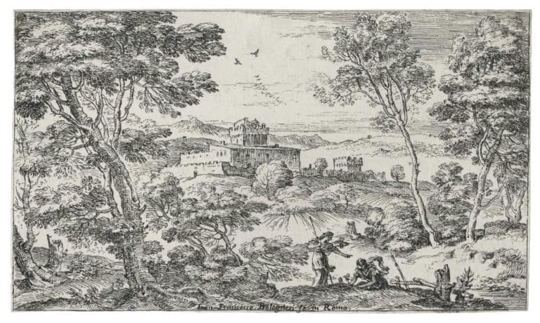 Landscape with a fortified farmhouse and two figures in the foreground