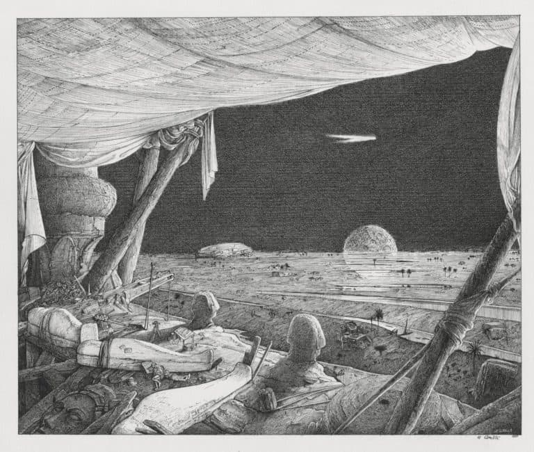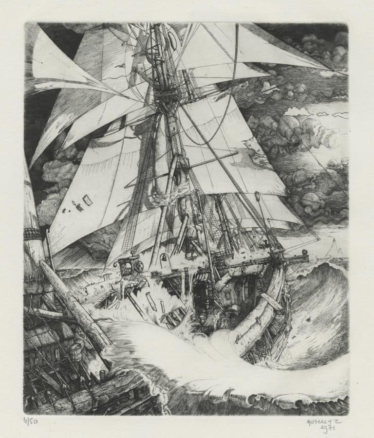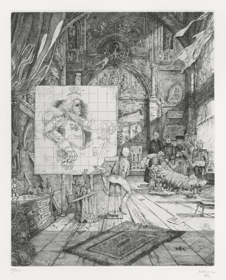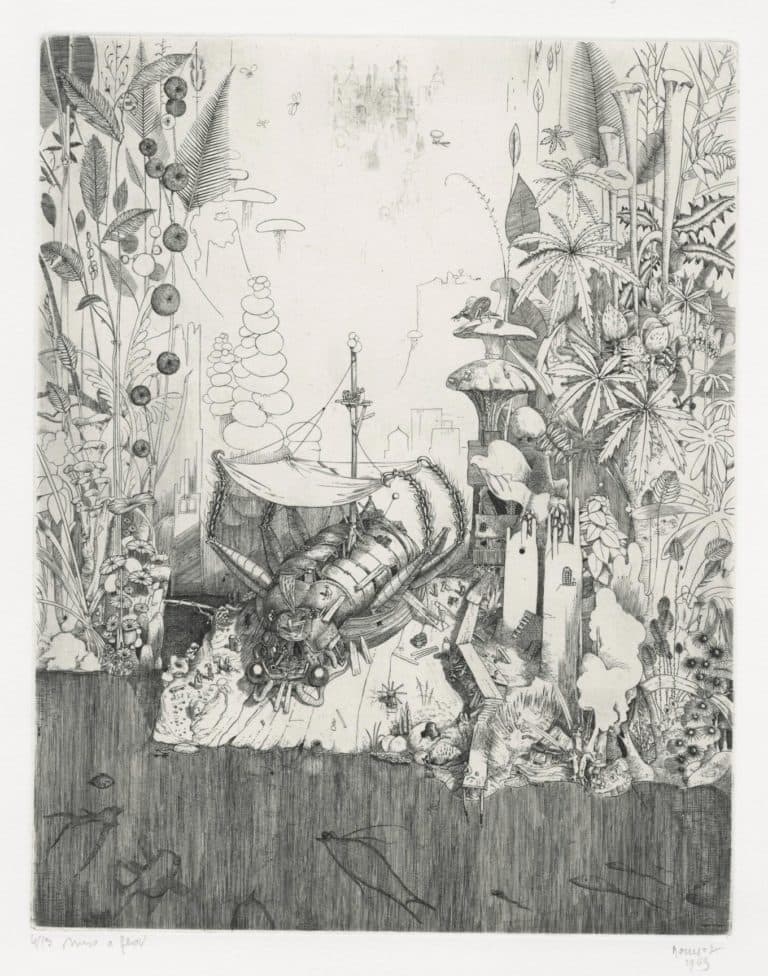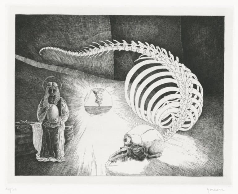 Real name Émile-Philippe Magaudoux, Philippe Mohlitz was born in 1941 near Bordeaux. In 1965, he joined the engraving classes run by Jean Delpech in Paris, where he worked alongside Erik Desmazières and François Houtin. Combining a fantastic and religious imagination close to surrealism with an exceptionally meticulous burin technique, his work soon attracted attention. In 1971, Mohlitz was awarded the Florence Gould Prize and became a resident at the Casa de Velázquez in Madrid. In 2000, he was awarded the Grand Prix Léon-Georges Baudry by the Taylor Foundation.