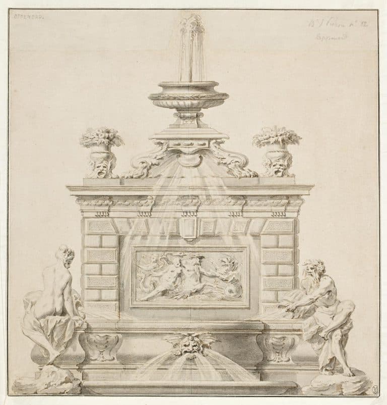 Gilles-Marie Oppenord, fils de l’ébéniste du roi, Jean Oppenord, a grandi dans l’atelier de son père. Elève de Jules Hardouin Mansart, Oppenord a séjourné à Rome de 1692 à 1699. À son retour à Paris, il a travaillé pour l’Eglise (Saint-Germain-des-Près et de Notre-Dame à Amiens) et a fourni des dessins pour illustrer des livres tout comme la mise en scène architecturale de la fameuse Galerie de sculpture de Girardon. Vers la fin de 1713, Oppenord est nommé Premier Architecte du duc d’Orléans pour s’occuper de la transformation du Palais Royal. Ensuite, il a reçu beaucoup d’autres commandes, notamment pour l’église Saint-Sulpice à Paris ; en 1722, il est anobli. Vers la fin de sa vie, Gabriel Huquier a publié son oeuvre gravé pour lequel Oppenord a fourni le dessin du frontispice. Oppenord a laissé un œuvre important de dessins et fut loué dès la Régence pour la qualité de ses feuilles.