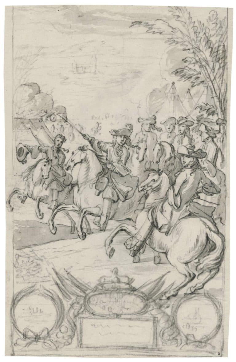 Born into a famous family of painters, Charles Parrocel joined a French cavalry regiment at the age of seventeen, before taking up the trade of his father Joseph, known as Joseph Bataille Parrocel (1646-1704). After leaving the service and sending a notable painting to Paris, the young man stayed from 1712 to 1721 as the king’s pensionnaire at the Académie de France in Rome. On his return to Paris, Parrocel was appointed to the Royal Academy of Painting and Sculpture and received numerous commissions for equestrian and military scenes. He executed several paintings and cartoons that served as models for the Gobelins tapestry factory. Parrocel also accompanied Louis XV on his campaigns in the Austrian Netherlands from 1744 to 1745, notably attending the Battle of Fontenoy.