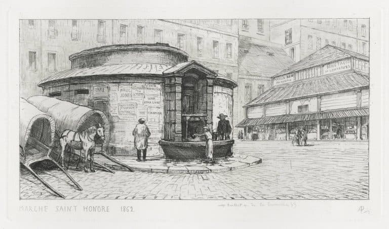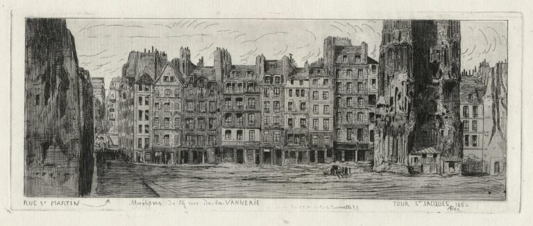 Adolphe Martial Potémont, mieux connu au XIXe siècle sous le nom de Martial, naquit à Paris en 1827 et y mourut en 1883 : il dédia l’essentiel et le meilleur de son œuvre à la capitale. Peintre parfois, il fut surtout un aquafortiste au métier sûr. De sa vaste production, se détache la suite de trois cents eaux-fortes intitulée L’Ancien Paris : elle assura sa renommée dès 1864. Architecturales, anecdotiques (Paris intime, 1874), sociales (Les Boulevards de Paris, 1877) ou historiques (Les Prussiens chez nous, Paris sous la Commune), ses planches, souvent organisées en séries, donnent toutes de Paris une vision pittoresque et préservent le souvenir de la ville que le baron Haussmann transformait alors radicalement. En tête de L’Ancien Paris, on lit : « D’éminents écrivains diront ce qu’étaient les habitations de nos pères ; ils parleront des constructions et des rues dont les noms sont restés ; ils décriront l’ancien Paris : ces eaux-fortes le montrent ». Potémont fut membre de la Société des aquafortistes et l’auteur d’un Nouveau traité de la gravure à l’eau-forte pour les peintres et les dessinateurs.