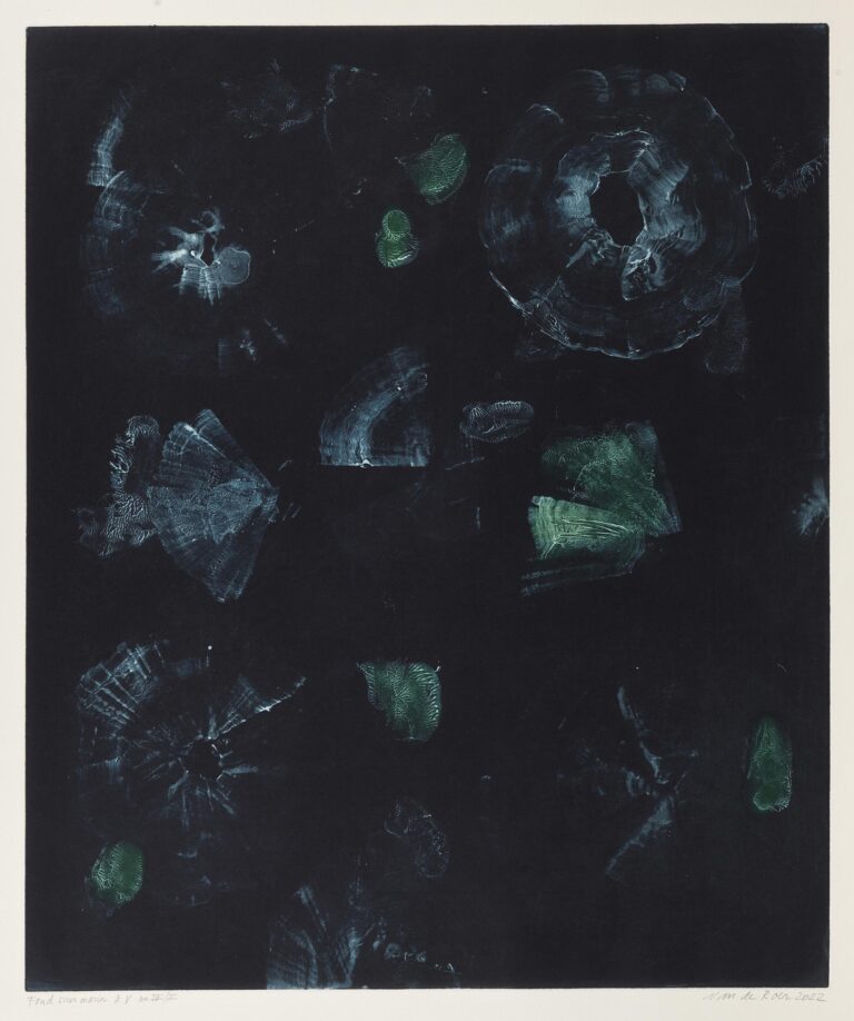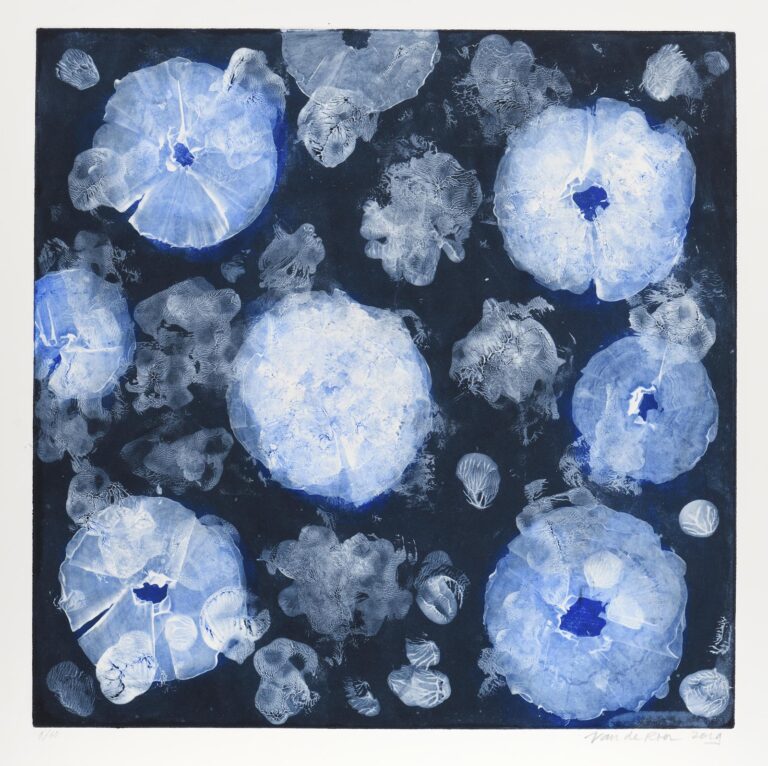 Artiste pluridisciplinaire, Michèle van de Roer s’adonne à plusieurs media, abordant tant la peinture que la gravure, mais aussi la photographie et la vidéo. Lauréate de la bourse Fulbright du Pratt Institute de New York, elle explore un monde onirique où la nature est omniprésente, jouant sur des formes florales et végétales. Forte d’une expérience auprès de Jacques et Robert Lacourière à l’atelier Lacourière-Frélaut à Montmartre, elle aborde la gravure avec une technique très contemporaine, conférant à son œuvre une matérialité particulière. Michèle van de Roer travaille à New York et à Paris et est aujourd’hui présente dans de nombreuses institutions françaises et internationales.