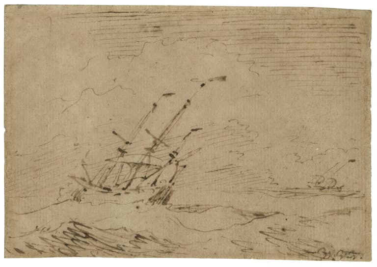 Fils de Willem van de Velde l’Ancien, Willem van de Velde le Jeune est très influencé par l’art de son père, son principal maître. L’artiste passe une grande partie de sa vie en mer, à voyager entre les Pays-Bas et l’Angleterre. Il arrive en Angleterre en 1672 avec son père et devient peintre officiel du roi Charles II en 1677. Ce nouveau statut l’oblige à retracer fidèlement les événements d’actualité maritime. On note le caractère réaliste des bateaux qu’il représente. Pour s’affranchir artistiquement de ce souci de fidélité dans la représentation, van de Velde créé sa propre technique personnelle. Elle revêt un caractère de minutie, d’exactitude. La mer reste l’objet d’une continuelle étude pour l’artiste. Il retranscrit ses différents mouvements, allant de la tranquillité paisible aux affres de la tempête. Petit-fils de marin, il n’a de cesse de représenter les bateaux de l’époque, s’inscrivant également grandement dans le contexte géopolitique de l’époque : entre guerres et représentation de la puissance maritime britannique. Pendant de la mer, le ciel tient également une place notable dans son œuvre. Les deux éléments sont souvent complémentaires et en arrivent même à se confondre.
