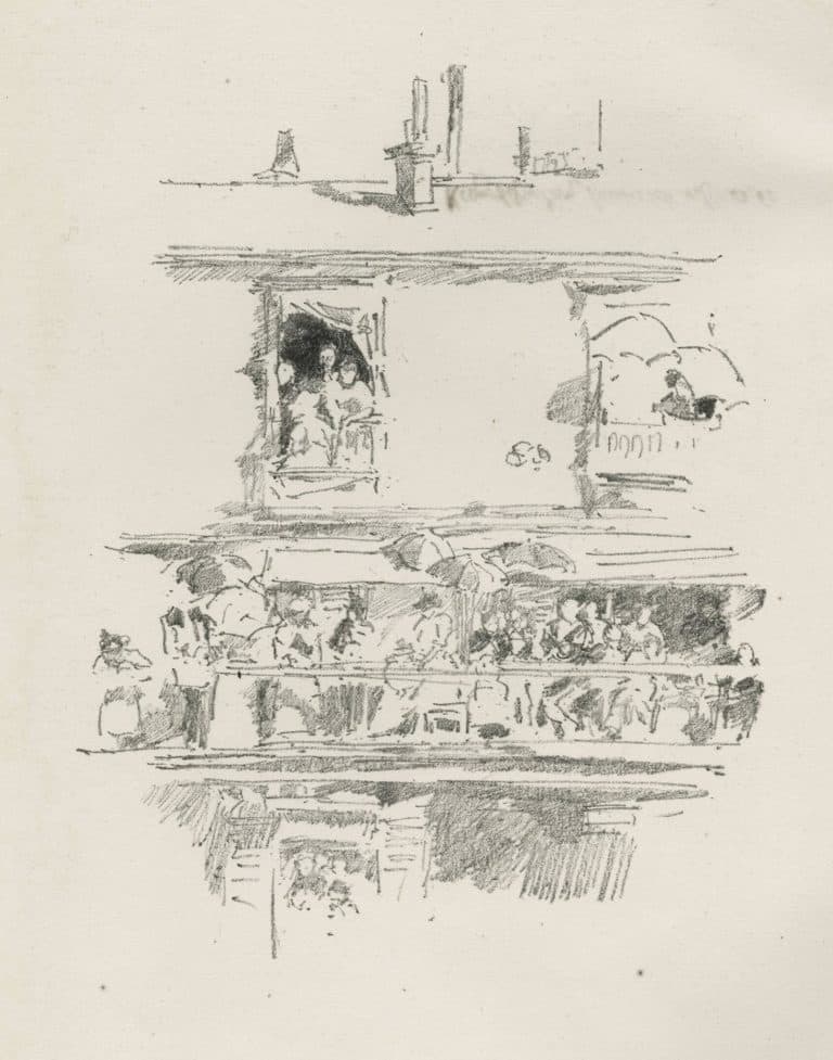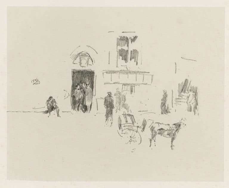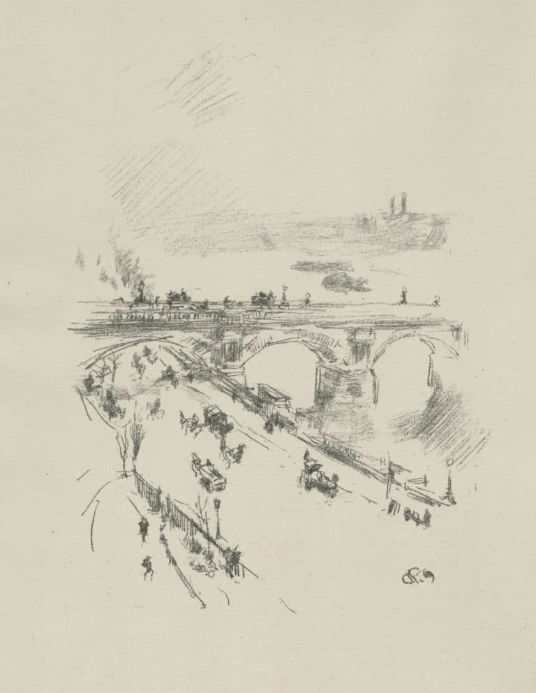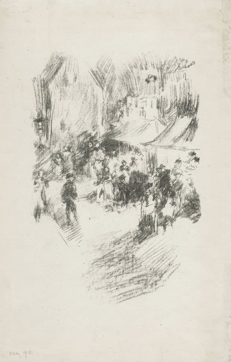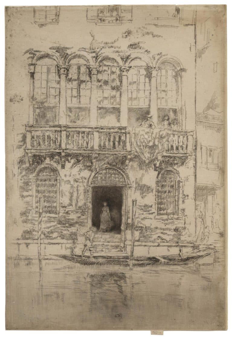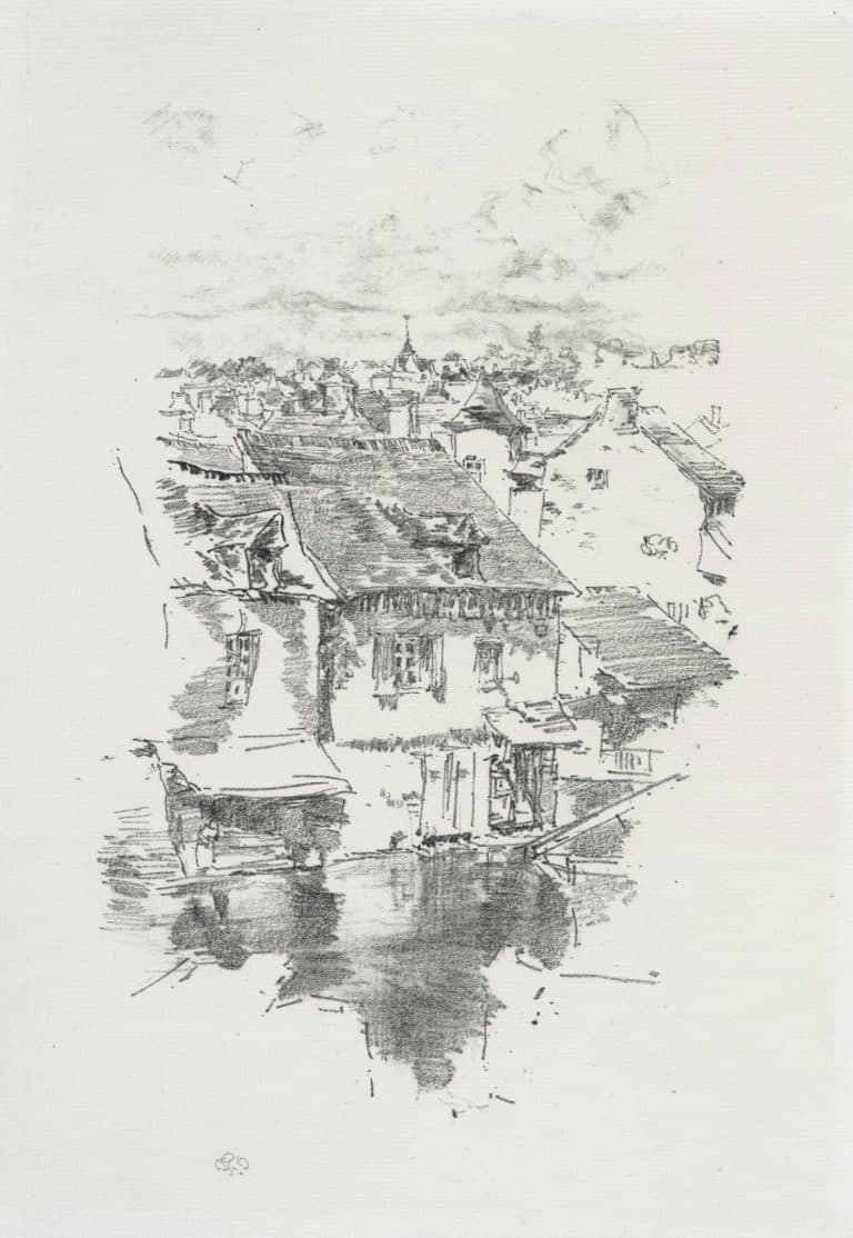Né aux États-Unis, où il passa les vingt premières années de sa vie, Whistler ne s’épanouit dans la carrière des arts qu’en Europe. D’abord proche des milieux réalistes français, le peintre trouva sa voie propre dans les différents tableaux de Nocturnes, d’Arrangements et d’Harmonies où le défenseur de l’art pour l’art put s’intéresser davantage à la suggestion des sensations qu’à la description du motif, à l’union des tons plutôt qu’au dessin. Ses aquarelles, ses pastels et ses estampes font preuve des mêmes évolutions et des mêmes qualités. Formé à la gravure pendant ses études militaires américaines, Whistler produisit dès son arrivée en France une suite d’eaux-fortes d’inspiration naturaliste qui le distinguèrent ; les séries suivantes, consacrées pour les plus importantes à la Tamise et à Venise, sont remarquables par leur grande économie de moyens dans le jeu des tailles, que contrebalancent de savants et vaporeux effets d’encrage. Les quelque cent quatre-vingts lithographies de Whistler, réalisées pour la plupart à la fin de sa vie, sont tout aussi virtuoses (et particulièrement ses expérimentales « lithotintes »).