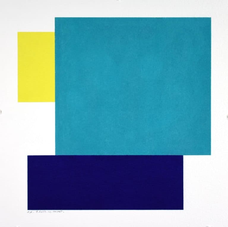 Avec ses formes géométriques et ses couleurs disposées en aplats, Yves Popet utilise le vocabulaire de l’art concret tel qu’édicté par Theo Van Doesburg (1883-1931) : « Peinture  concrète et non abstraite parce que rien n’est plus concret, plus réel qu’une ligne, qu’une couleur, qu’une surface. » Le choix des couleurs stridentes évoque la passion de Popet pour la peinture maniériste italienne. La monochromie et la répétition du motif – le carré tout particulièrement – sont deux autres aspects de son travail. La simplicité n’est qu’apparente. À travers une approche intuitive et sensuelle, il nous invite ainsi à plonger dans l’infini de l’art. Et à suspendre le temps.