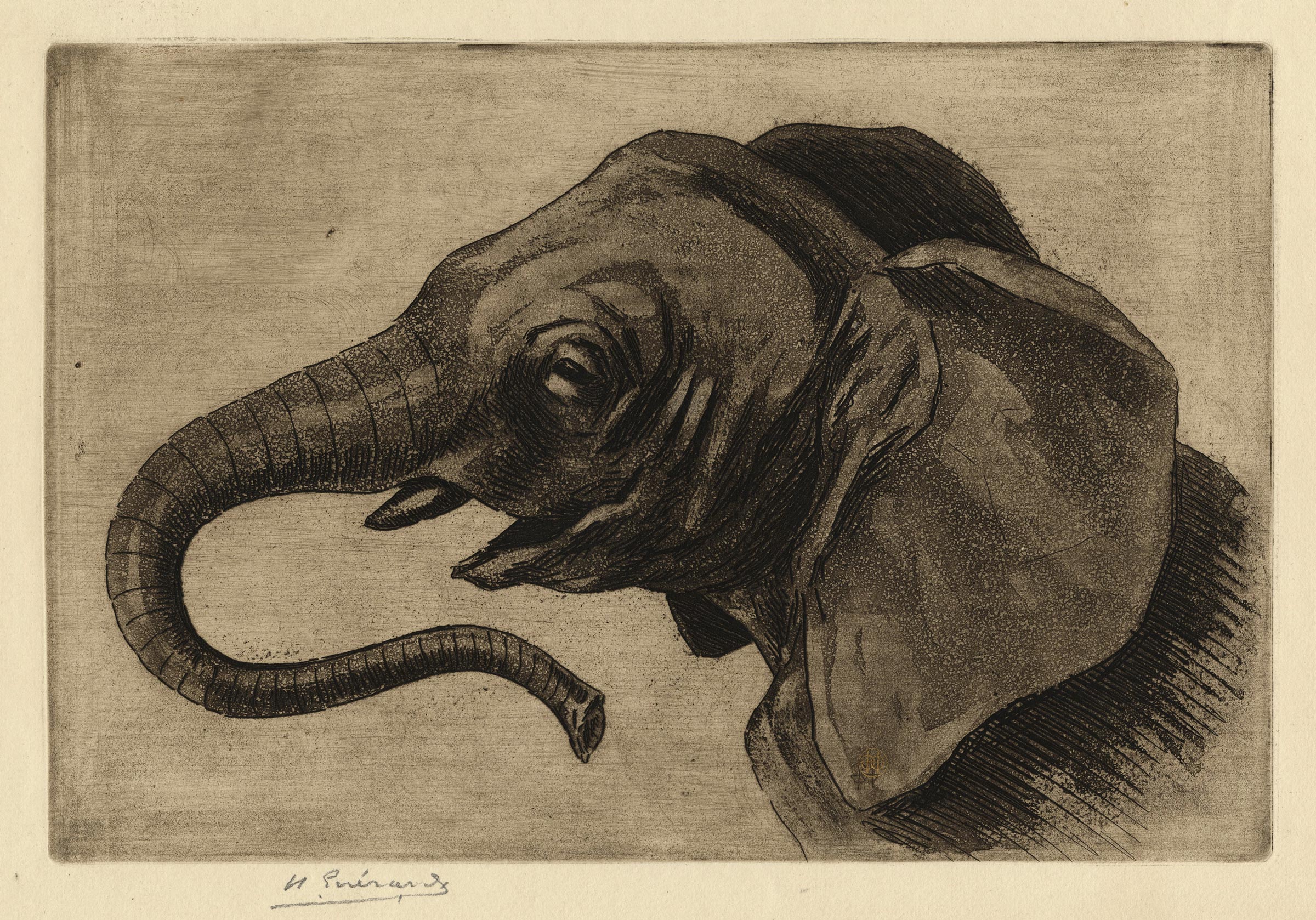 Belle épreuve sur vergé crème de l’état définitif, avec la manière noire effacée et le fond éclairci, signée H. Guérard, léger empoussiérage le long des bords gauche et supérieur, petite épidermure au niveau de l’oreille de l’éléphant