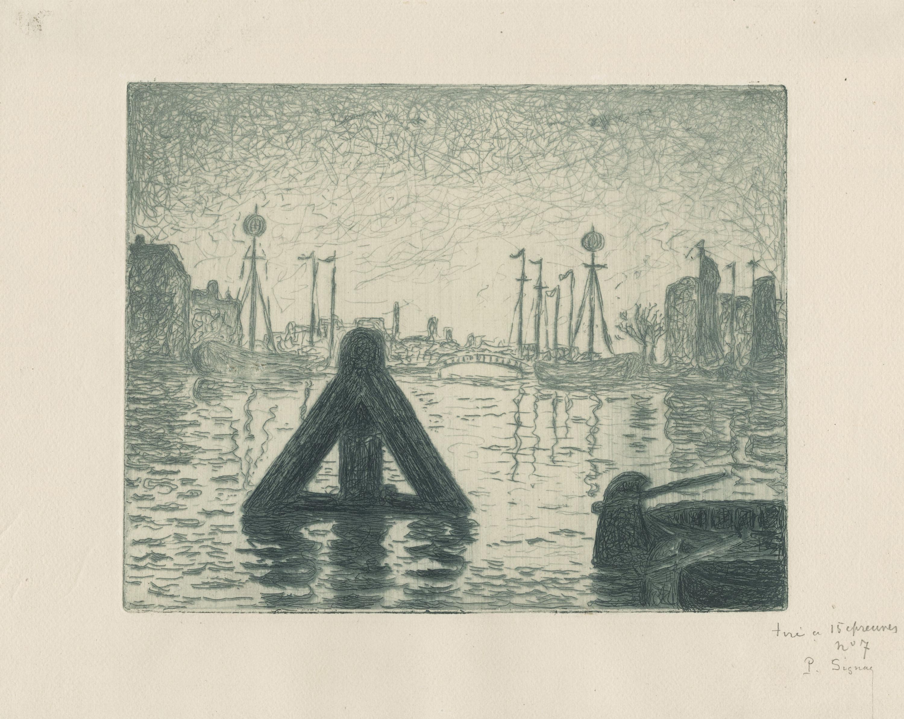 Belle épreuve imprimée en vert foncé sur vergé d’Arches, signée et numérotée par l’artiste tiré à 15 épreuves, n°7, tirage total à 25 épreuves, imprimé par Eugène Delâtre à Paris, marges jaunies, anciennes charnières au verso